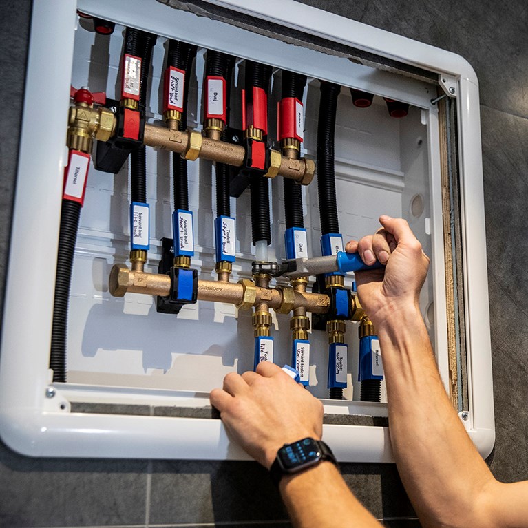 vannskadesikre installasjoner. Systemet består av blant annet rør, koblinger, fordelere, veggbokser